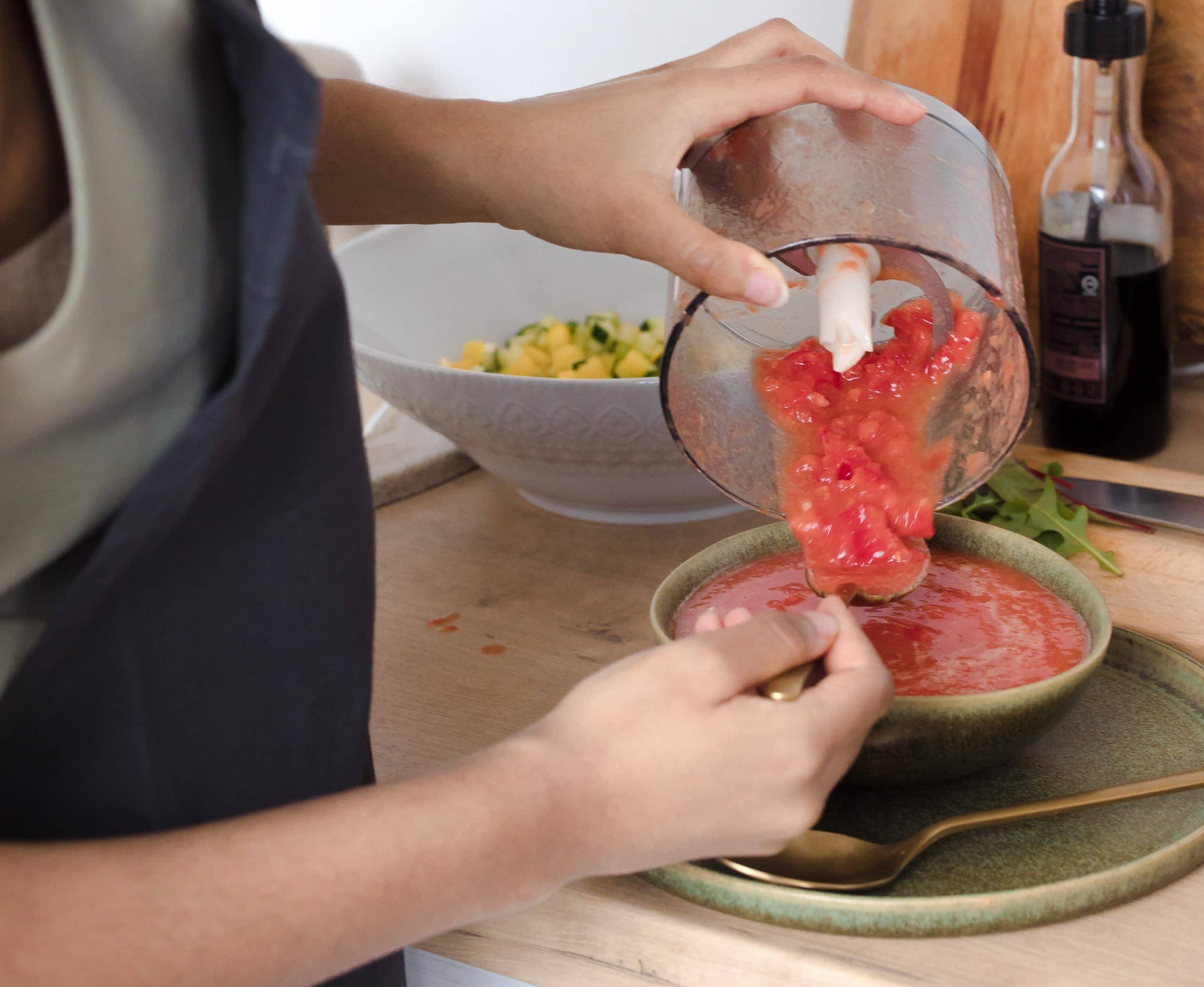 Z powodzeniem możemy też zmiksować zupę w wysokoobrotowym blenderze wolnostojącym wyposażonym w kielich odporny na działanie wysokiej temperatury, np. z hartowanego szkła lub tritanu. Musimy liczyć się z większą ilością brudnych naczyń po zakończeniu pracy, lecz w zamian dostaniemy krem o naprawdę gładkiej i jedwabistej konsystencji.