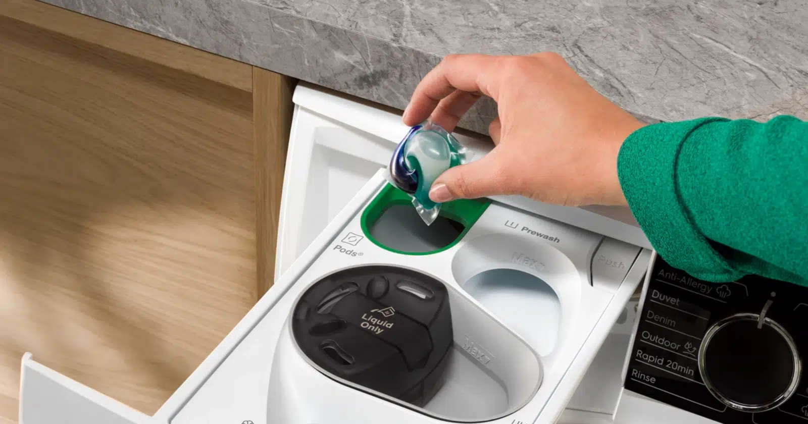 - Cichszy przepływ wody – koniec z głośnym szumem podczas pobierania detergentu.