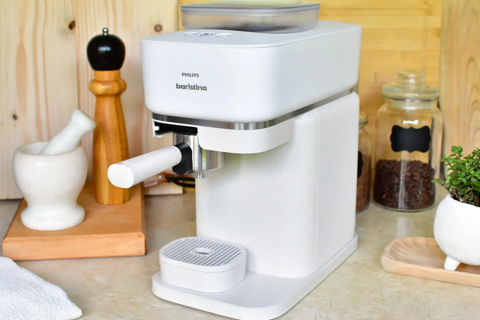 Już na pierwszy rzut oka Baristina prezentuje się całkiem nieźle – całość zachowana w matowej, mlecznej bieli tworzy elegancki, a zarazem ponadczasowy design. Ten model ekspresu dostępny jest również w czarnej wersji kolorystycznej. Możliwy jest także wybór spośród kilku kolorów uchwytu portafiltra.