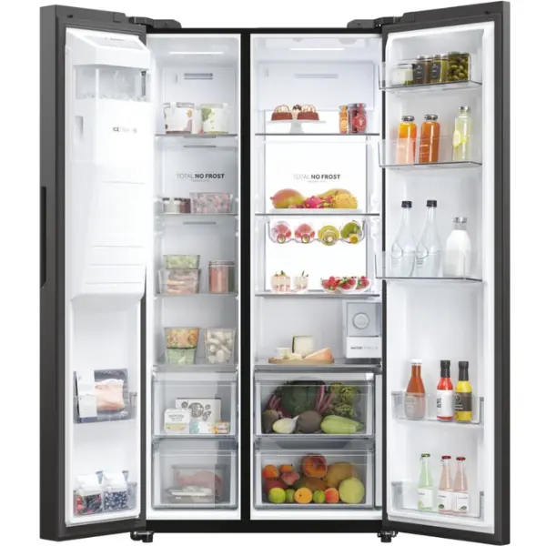Lodówka side by side Haier HSW79F18DIPT oferuje łączną pojemność 601 l, na którą składa się 391-litrowa chłodziarka oraz 210-litrowa zamrażarka. Pomiędzy komorami zastosowano specjalną osłonę zapobiegającą mieszaniu się aromatów przechowywanych produktów oraz minimalizującą straty energii. W obu komorach wykorzystano natomiast funkcję no frost (Total No Frost), która zapobiega osadzaniu się szronu na ściankach urządzenia i sprawia, że lodówki nie trzeba rozmrażać.