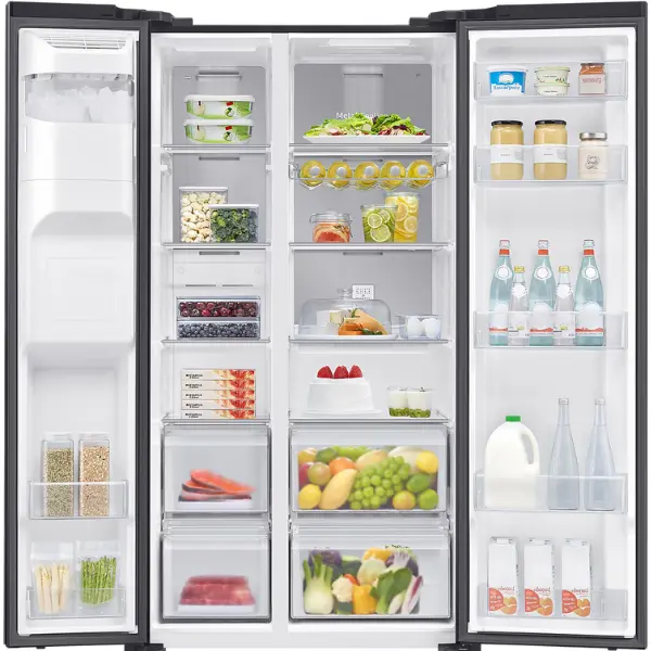 Nowoczesna lodówka side-by-side Samsung RS65DG54M32C ma łączną pojemność 635 l, na którą składają się 417-litrowa komora chłodziarki i 218-litrowa komora zamrażarki. Zwiększona pojemność przy zachowaniu standardowych wymiarów zewnętrznych to zasługa technologii SpaceMax™. Dzięki niej ścianki urządzenia są cieńsze – zajmują mniej przestrzeni, a jednocześnie izolują równie skutecznie, co ścianki o standardowej grubości. Co więcej, wbudowana w drzwi kostkarka slim „zwalnia” miejsce na półce zamrażarki, zapewniając jeszcze większą elastyczność w rozmieszczeniu produktów.