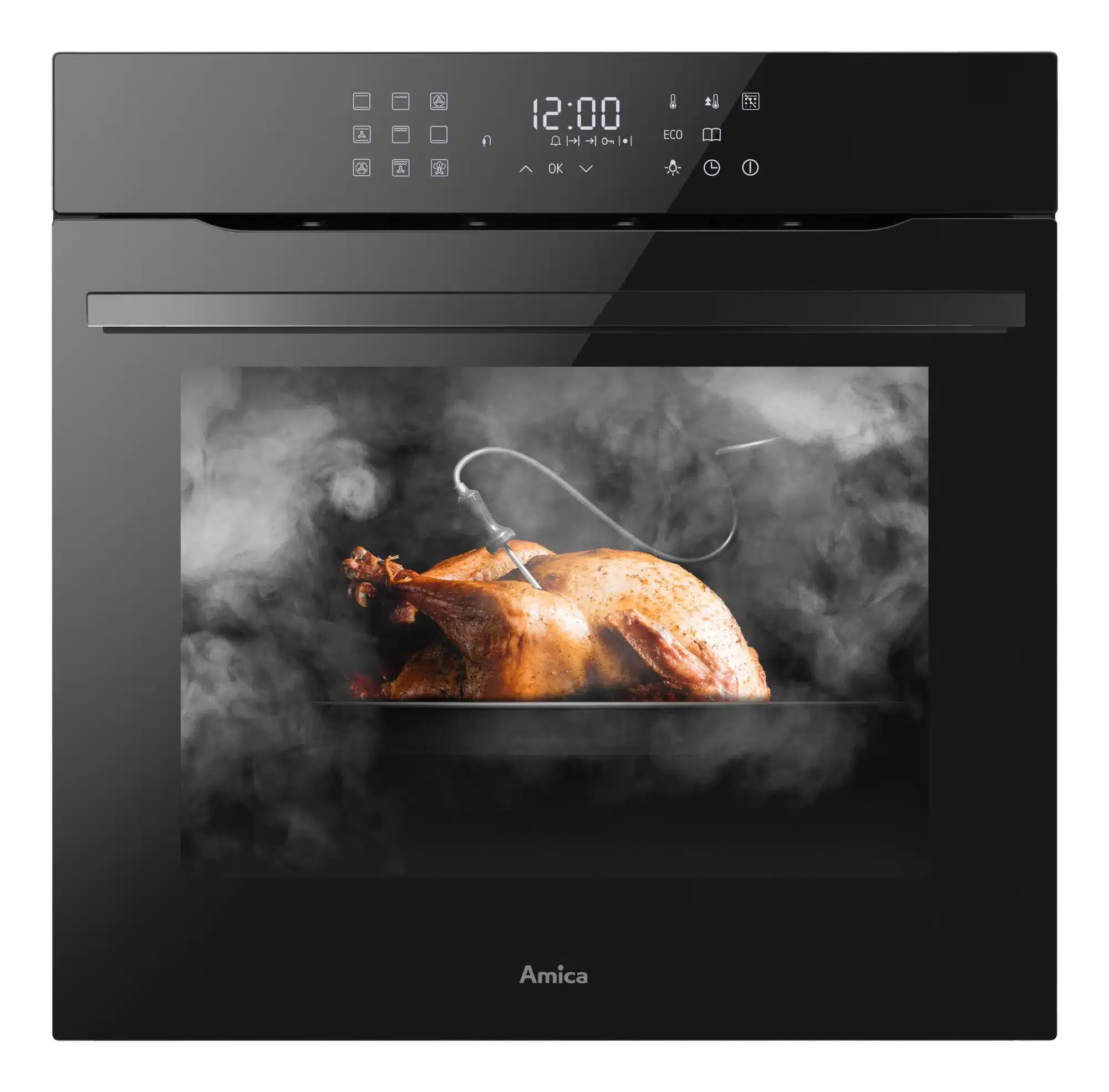 Piekarnik Amica wyposażony jest w opcję pary SoftSteam, która pozwala przygotować bardziej soczyste i wilgotne dania, które pokryte są chrupiąca skórką. Umożliwia tez podgrzewanie gotowych potraw bez ich wysuszania i utraty walorów smakowych. Mamy tu do czynienia z najprostszą technologią parową – do wgłębienia w dnie piekarnika wlewa się wodę, która następnie paruje podczas całego cyklu pieczenia. Producent wyposażył ten piekarnik również w termosondę, która kontroluje temperaturę wewnątrz potrawy i automatycznie kończy pieczenie w optymalnym momencie. Sterowanie urządzeniem odbywa się z poziomu dotykowego panelu, na którym możemy wybierać spośród 19 gotowych programów lub samodzielnie ustawić wszystkie parametry, korzystając z 11 dostępnych funkcji pieczenia i zakresu temperatur od 30 do 280oC.