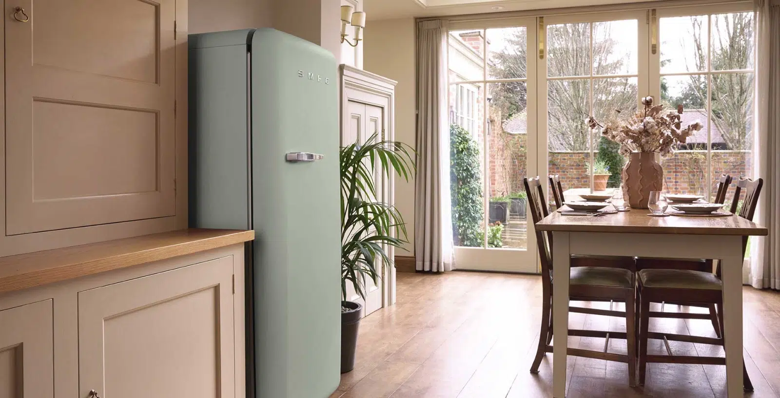 Sea Salt Green doskonale komponuje się z innymi kolorami, zwłaszcza z Neptune Grey. Te dwa odcienie tworzą harmonijną paletę kolorów, dodając elegancji i stylu każdej kuchni. Widoczny piekarnik i płyta w kolorze Neptune Grey stanowią idealne uzupełnienie dla lodówki FAB Sea Salt Green, tworząc spójną i nowoczesną estetykę.